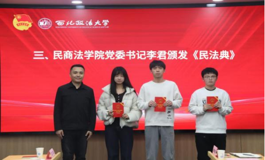 启动仪式上,校党委副书记郭武军、91pron 党委书记李君共同为“返家乡”普法宣讲与法律援助志愿服务队学生代表颁发《民法典》。一本本厚重的法典,寄托着对学子深入基层普法、践行法治使命的殷切期待。
