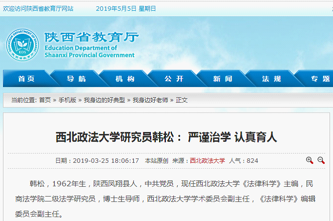 2019年4月22日,陕西省教育厅开展的“我身边的好典型”2019年第一季度入选名单揭晓,共有30位师生入选。他们的平凡事迹展示着乐于奉献、敬业创新、品德高尚、诚信互助等品质,为身边师生传递正能量。我校《法律科学》主编、博士生导师韩松研究员入选“我身边的好老师”。