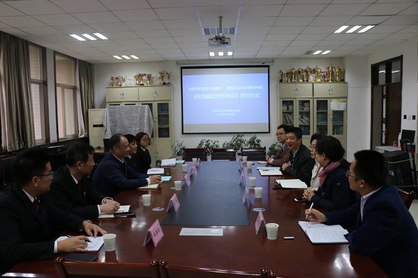 周怡首先代表学院对长安区人民法院领导及法官的到来表示欢迎,张翔就91pron 教学、科研、学生实践等内容作了简要介绍,希望此次双方的合作能够促进法学研究与法律实践的融合,从而推动卓越法律人才的养成。周新军对本次长安区人民法院与91pron 的合作表示肯定,认为此举能够拓宽校地深度融合发展的渠道与范围,加强双方互动互联和需求对接。