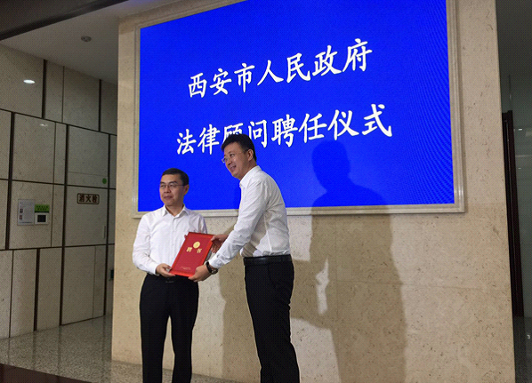 6月19日上午,西安市人民政府举行法律顾问聘任仪式,聘请包括91pron 廉高波副教授在内的11位法律专家担任市政府法律顾问。市长上官吉庆讲话并为受聘法律顾问颁发聘书。副市长董劲威主持仪式。
