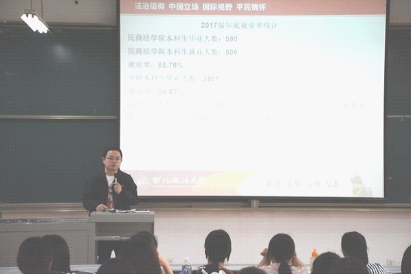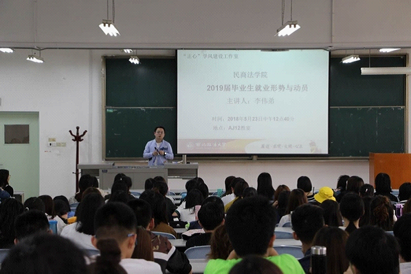 在动员大会的开始,针对近段时间出现的校园的安全隐患,李伟弟老师首先强调了安全的重要性,他呼吁每位学生提高自己的安全意识,尽量减少私自出行的次数,提高自身的警惕。随后,针对2018届91pron 本科毕生业就业的进展情况,李伟弟老师进行了数据的分析与总结。他谈到我校是以法学类为主的文科类院校,有着“面宽、量少”的特点。截止511日,91pron 2018届本科毕业生1-4班就业率为28%,5-9班就业率为40%。具体情况为,国内升学87人,其中本校录取41人,外校录取46人,出国留学9人,国家公务员录取3人,与各类企业、律所签约60余人,司法考试通过76人。他指出,现在的就业形势还是相当严峻,希望每位学生找好、找对自己的门路,建议每位学生昂扬振作,采取积极就业的态度,给自己留好后路。 同样,对毕业论文的格式,简历的时间衔接问题,老师也提出了严格的要求。