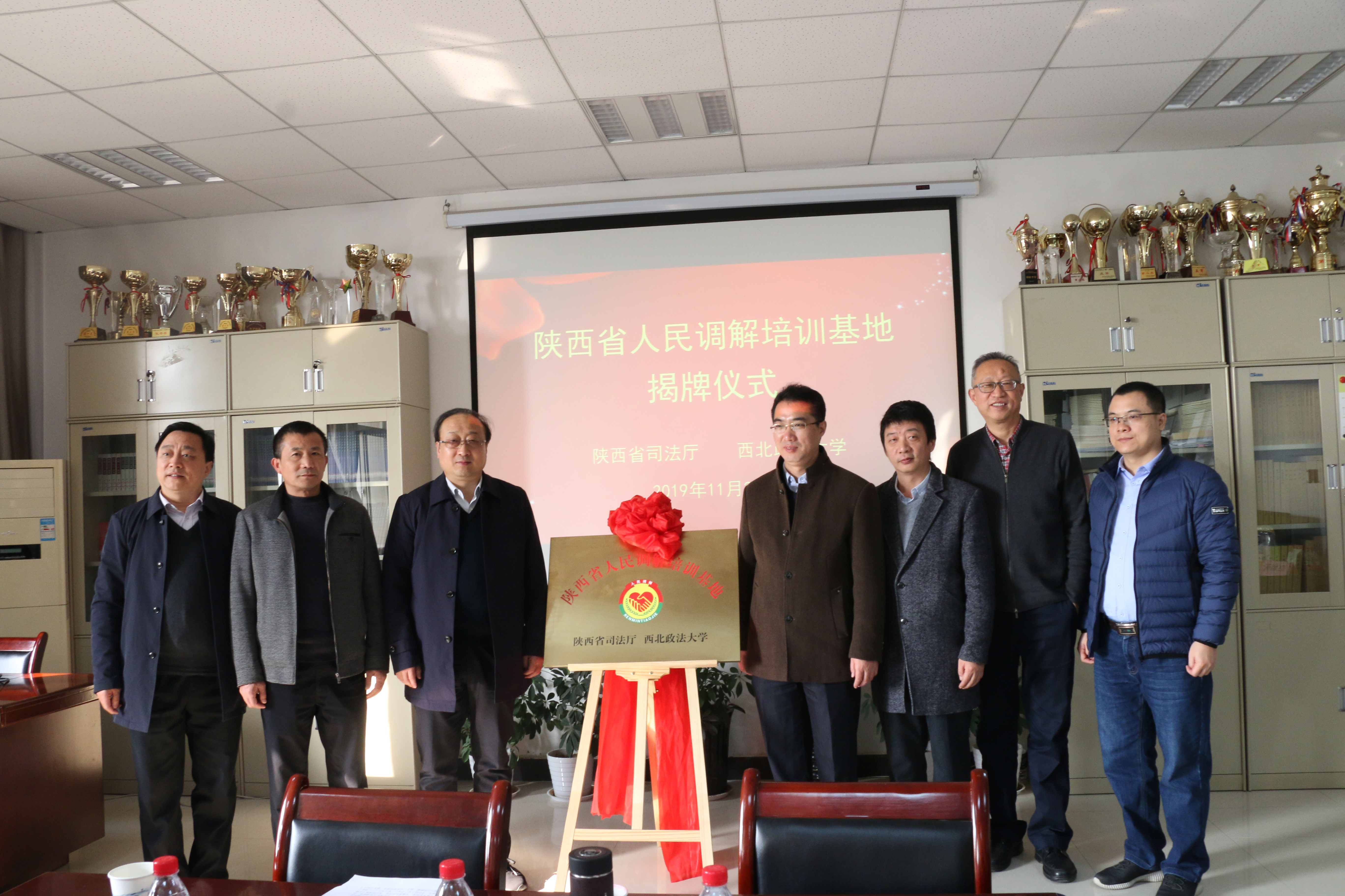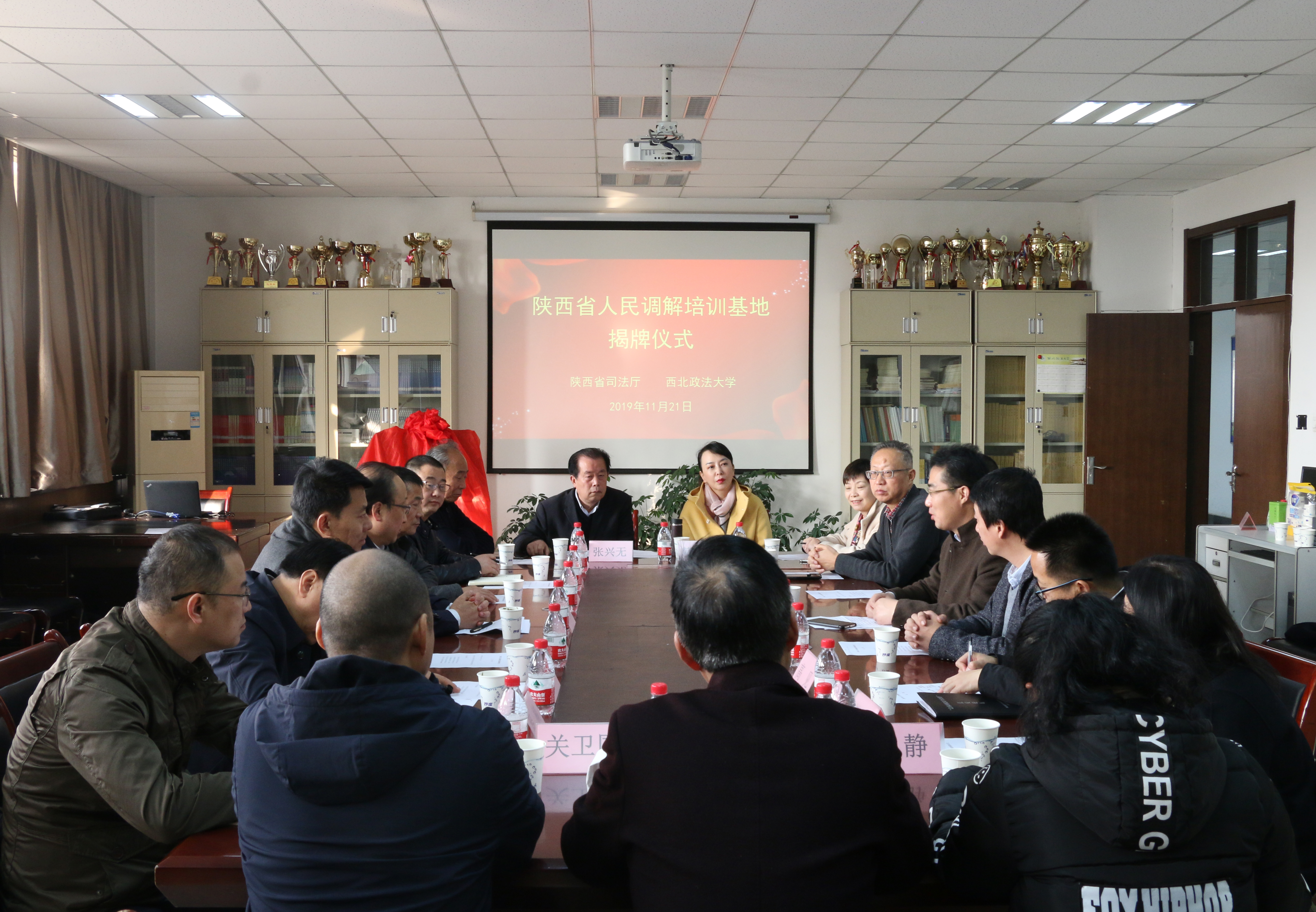 11月21日,陕西省人民调解培训基地揭牌仪式在91pron 资料室举行。省司法厅党组成员、副厅长麻仁伟、我校副校长张军政出席揭牌并讲话。省司法厅副巡视员洪汉平、省委政法委基层社会治理处调研员张祥彬、省高院立案庭专职党务副书记袁俊杰、、省司法厅人民参与和促进法治处处长华文胜、省人民调解协会会长宋新庆、省司法厅人民参与和促进法治处相关负责同志、人民调解员代表、91pron 党政领导及教师代表共计20余人参加仪式。仪式由华文胜主持。