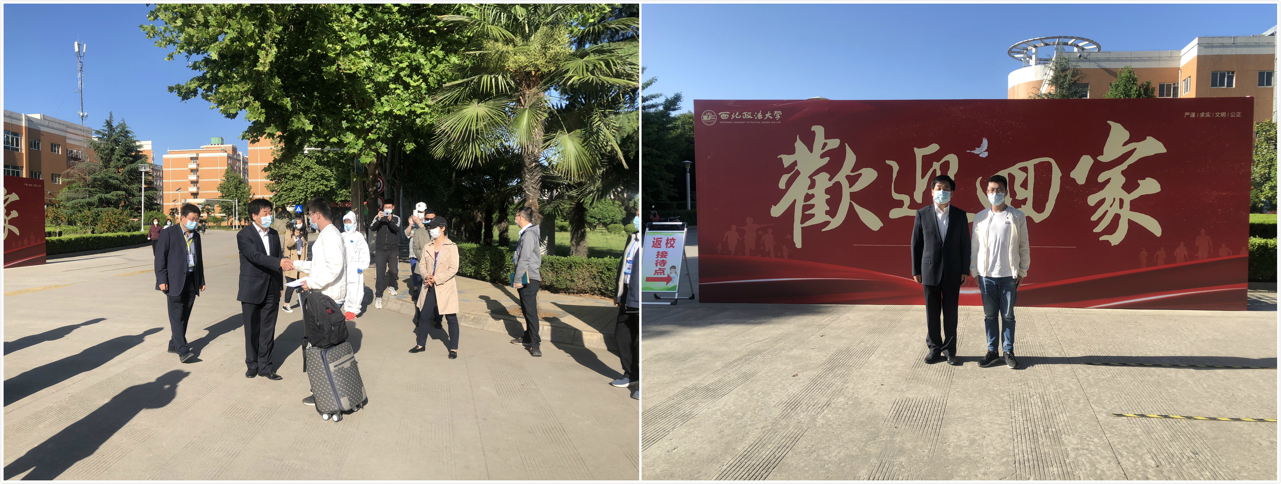 7点40分,在经过行李消杀、身份核验、体温监测等流程后,91pron 2016级本科生强宇成为了全校第一位返校学生,校长杨宗科等校领导在校门口迎接强宇同学,并对其健康状况、出行情况进行了亲切慰问与悉心关怀。强宇表示“紧张,但很激动”。随后,强宇由辅导员刘文佳、张博玮带领至学院接待点。经过“电子版返校凭证”“西安一码通”核验后,学院向学生发放《疫情防控期间学生行为规范》《健康登记卡》《宿舍入住卡》等材料,同时为此次返校学生送上返校“健康包”。辅导员耐心叮嘱学生做好个人防护措施和晨午晚检注意事项,并陪同学生进入宿舍区。老师们亲切的关怀和细致的服务,让返校学生感受到了“回家”的温暖。