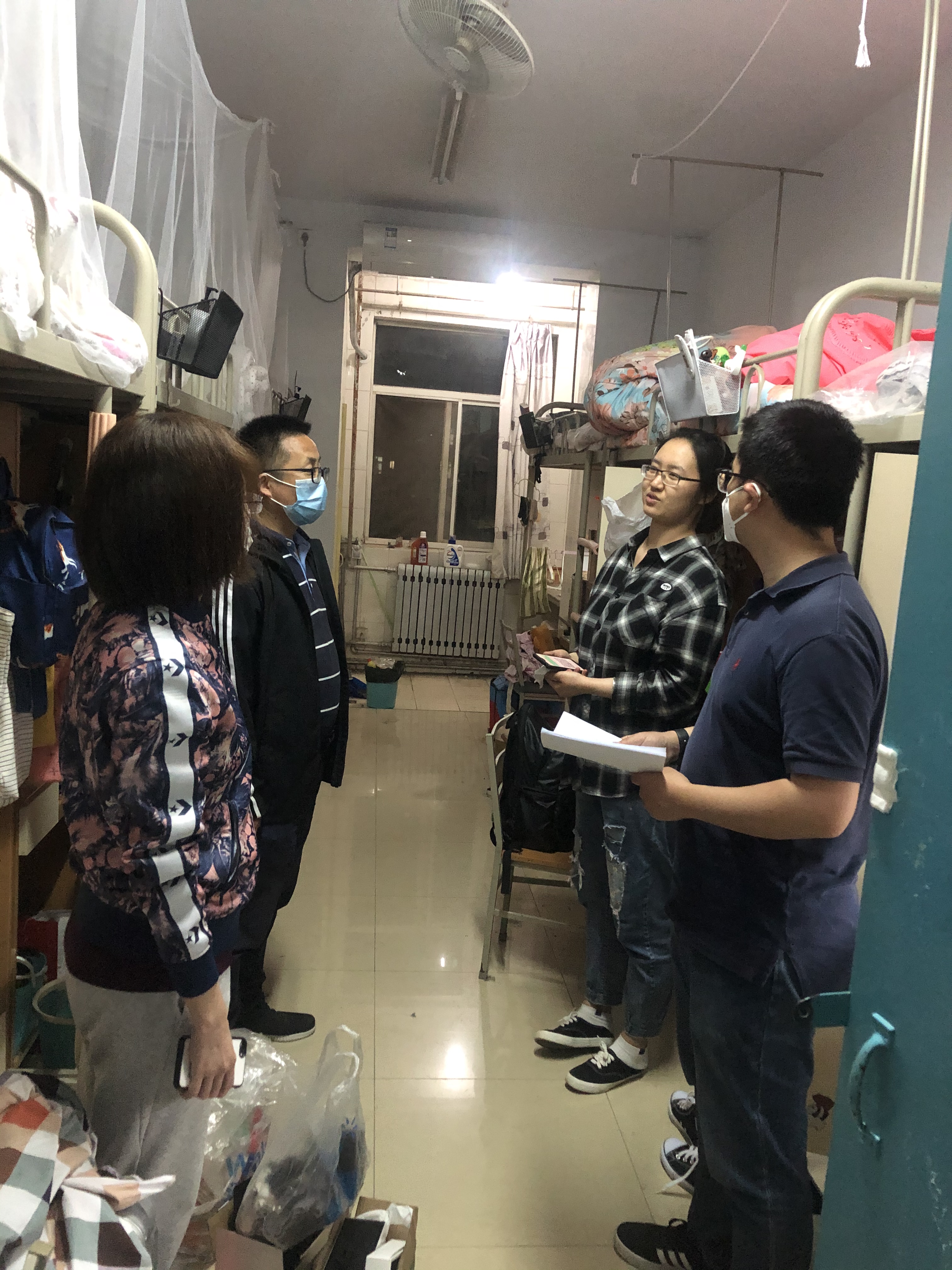 晚上10点,高见、刘文佳、张博玮深入宿舍看望返校学生。从防“疫”中的个人成长到毕业论文的道阻且长,从就业选择的焦灼思量到考研初试的喜悦分享,楼道里洋溢着师生间的嘘寒问暖。高见提醒同学们要做好防护措施,遵守学校相关规定。同时鼓励大家要以积极的心态面对疫情当下的就业形势,遇到困难及时向老师寻求帮助。