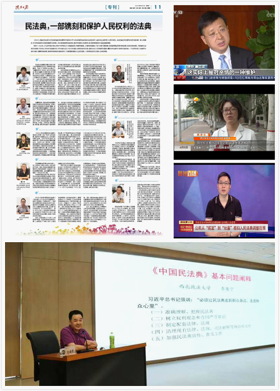 发挥专业优势宣讲《民法典》,助力《民法典》普及。一是整合专业资源,鼓励“走出去”。学院高度重视《民法典》宣讲工作,第一时间集结学院优质师资力量,为老师们“走出去”牵线搭桥,搭建宣讲平台。二是组建宣讲团队,形成宣讲专题。根据宣讲对象的特点及要求,采用“菜单式”“定制式”模式确定宣讲内容。目前,学院宣讲团队已面向省内外党政机关、高校、企事业单位及法律实务部门开展宣讲及接到预约邀请数十场。三是充分利用媒体平台,普及《民法典》。学院韩松、张翔、李康宁、董少谋、廉高波、郝佳、陈凌云、孙政伟等多名教师在中央电视台、《人民法治》杂志、中国妇女报、陕西电视台、陕西日报等重要媒体为《民法典》积极发声,为《民法典》的宣传推广贡献了重要力量。