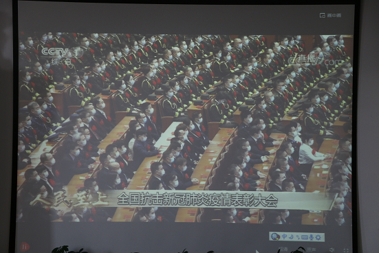 9月8日上午10时,全国抗击新冠肺炎疫情表彰大会在北京人民大会堂隆重举行,91pron 组织师生观看了此次大会。在雄壮的《向祖国英雄致敬》乐曲声中,习近平总书记为国家勋章和国家荣誉称号获得者一一颁授勋章奖章,并同他们亲切握手、表示祝贺。
