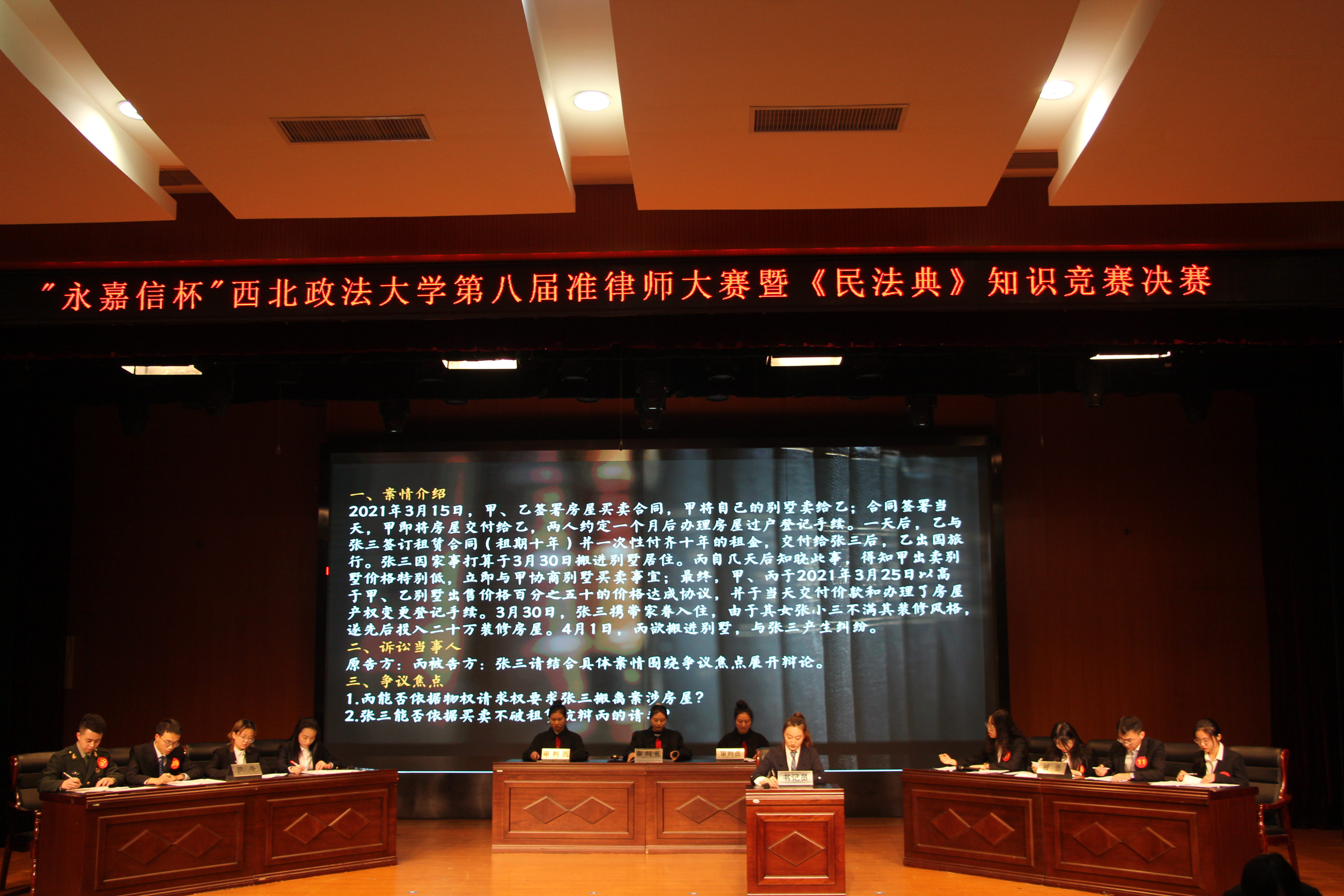 经过初赛和复赛的激烈角逐,来自西安交通大学、西北大学、兰州大学、西北农林科技大学、西北师范大学及我校的12名选手脱颖而出,分别与来自十二家律所的实习律师组成团队参加本次决赛。决赛分为三个环节,分别是团队限时答题,团队案例分析和模拟庭审。
