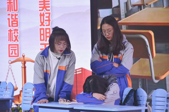 紧随其后的是情景剧表演。通过讲述受害者李小斐同学在公交车、学校以及网络上的不幸遭遇,反映了校园暴力尤其是冷暴力的恶劣性与危害性。公交车上大妈的蛮横无理,家庭温暖的缺失,网络上的诽谤凌辱,学校里同学的欺凌,都带给李小斐同学产生了严重的身体和心灵创伤。情景剧表演让同学们明白了校园冷暴力是对个人、家庭及社会的严重威胁,具有深刻的教育意义。