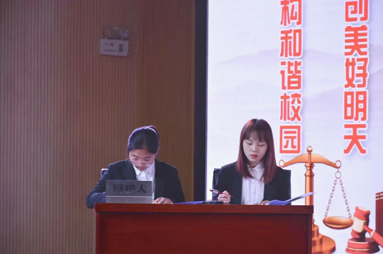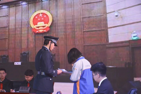 接下来的模拟庭审环节承接情景剧表演,根据相关法律法规对施暴者进行判决。模拟法庭真实地再现了法庭审判场景,帮助同学们近距离接触法庭,了解法庭审判,切身感受司法的庄严与法律的神圣,普法宣传效果显著。