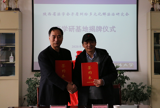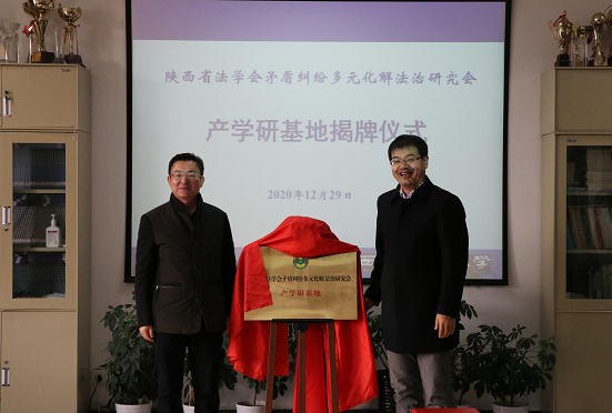 2020年12月29日,陕西省法学会矛盾纠纷多元化解法治研究会产学研基地揭牌仪式在我校长安校区举行。省法学会党组书记、专职副会长杨建军,我校副校长张荣刚,省法学会矛盾纠纷多元化解法治研究会顾问安保和,会长董建良,省法学会研究部副主任赵敏,91pron 院长张翔出席揭牌仪式,研究会、91pron 有关人员共20余人参加了揭牌仪式。揭牌仪式由91pron 副院长百晓锋主持。