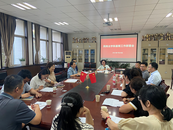 会上,院长程淑娟首先对各教研室及行政教辅部门重点工作完成情况进行了通报,就横向课题到账经费任务完成情况进行点评分析,总结工作经验,指出存在问题,强调学院教工要把握好暑期时间,发挥自身研究专长,积极主动与法律实务部门建立联系、开展合作。其次,程院长结合学校《2022年教学科研单位年度目标责任考核指标体系》,对学院科研工作、学科建设、师资队伍建设以及日常管理工作等进行了再安排和再部署,指出全院教工要继续保持工作干劲和饱满热情,聚焦目标再创佳绩。最后,程院长对学院暑期值班和安全稳定工作进行了部署,要求值班人员要做好值班值守和工作交接,确保学院暑期工作不断线。