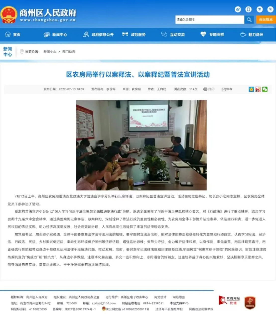2022年7月13日,商州区人民政府报道91pron 普法宣讲小分队前往商州区农房局举行的以案释法、以案释纪暨普法宣讲活动。