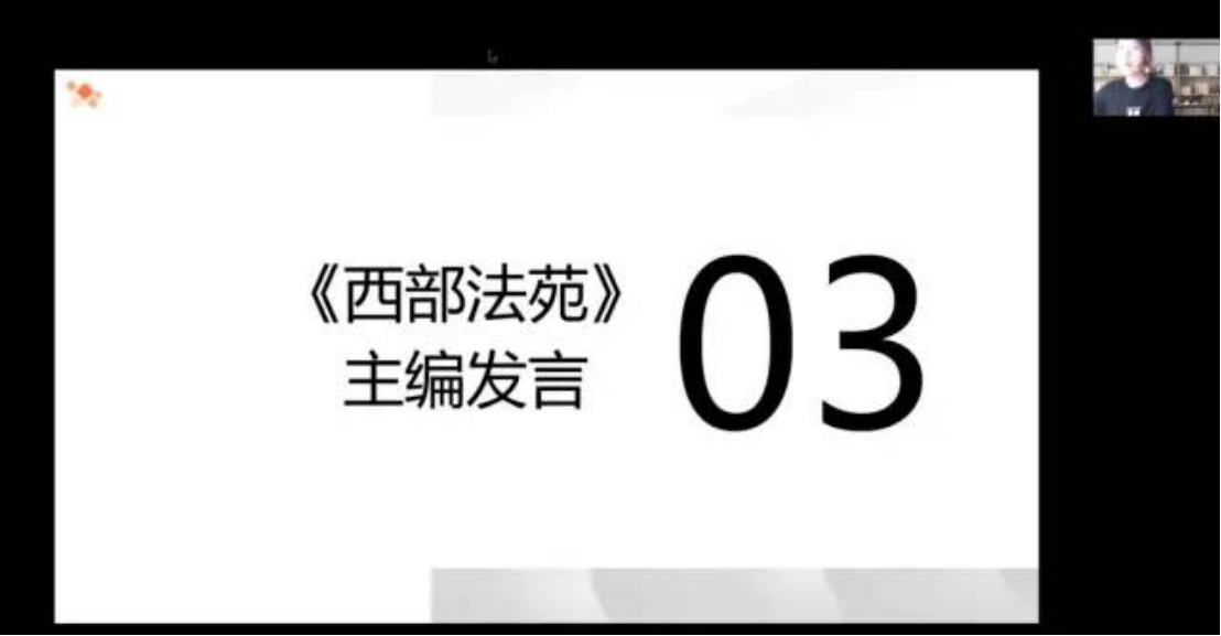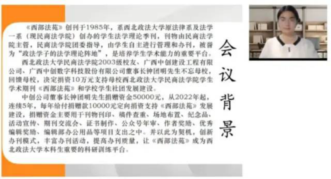 会议伊始,主持人《西部法苑》副主编孟庆莉同学主持会议开始致欢迎辞并介绍本次线上交流会的会议背景与《西部法苑》刊物的发展现状,代表全体编辑部成员对钟团明先生及中创公司的赠与支持表达了诚挚的谢意。